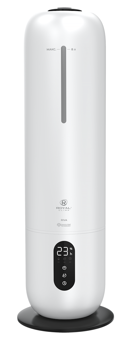 Увлажнитель воздуха RIVA (РИ́ва) от ROYAL CLIMA обладает революционным увеличенным объемом резервуара для воды: 8 литров. Работа без долива воды от 26 часов. Максимальная интенсивность увлажнения воздуха 300 мл/ч.